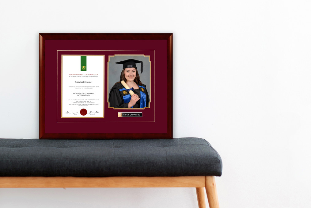 Made in Australia using archival quality materials, this workmanship guarantees your hard-earned certificate is protected for years to come. A range of frame styles and mats have been chosen to be a perfect match for either the traditional or contemporary space. Mats are embossed with the University insignia creating a sophisticated backdrop for a very important document.